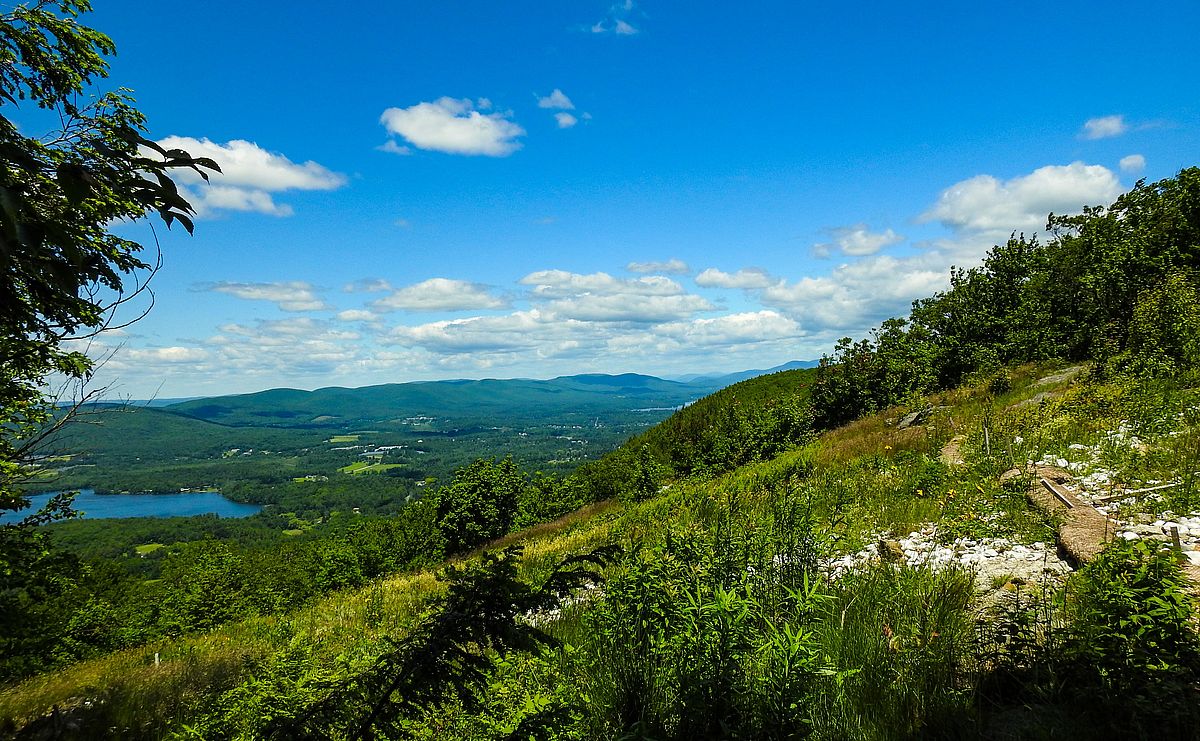 The High Road crosses Lenox Reservoir Road where hikers can park and the trail north to Lenox Mountain begins. The trail crosses land managed by Lenox Water Company, BNRC, and Mass Audubon illustrating the many partnerships that undergird The High Road. Starting on a logging road that crosses several streams, the trail turns north and begins a gentle rise up Lenox Mountain along Yokun Ridge through a rich mix of both deciduous and coniferous groves. The last section of the trail is short but steep and eroded. The western view at the top of Lenox Mountain includes Richmond Pond, Pittsfield, and Hancock, including Hancock Shaker Village and Berkshire Community College. If the weather cooperates, the apple trees in Bartlett’s Orchard will be in bloom to enhance the view and to perfume the air at the summit.